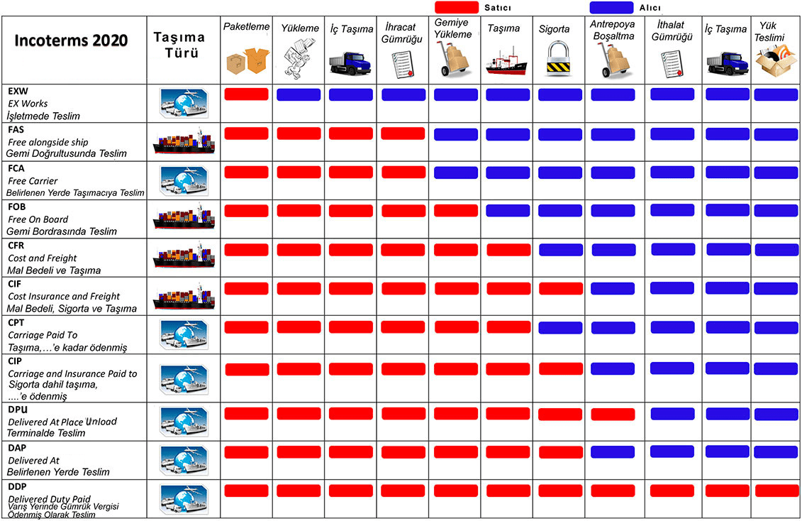 - Satıcı tüm sorumluluğu alır: taşıma, gümrük, vergi, sigorta.